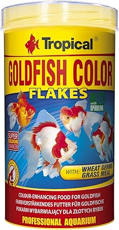GOLDFISH COLOR es un alimento multi-ingrediente potenciador del color en forma de escamas destinado para la alimentación diaria de todas las variedades de peces dorados y carpas koi jóvenes. Cuenta con un alto contenido de fibra, que proviene entre otros, de la mezcla de hierba y alfalfa, que se encargan del buen funcionamiento del tubo digestivo de este grupo de peces. El inmunoestimulador natural, beta glucano y la vitamina C estabilizada, refuerzan el sistema inmunológico. La utilización regular del alimento GOLDFISH COLOR – con astaxantina y extracto de pimiento rojo – intensifica los colores de los peces.